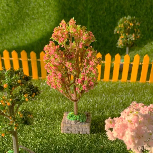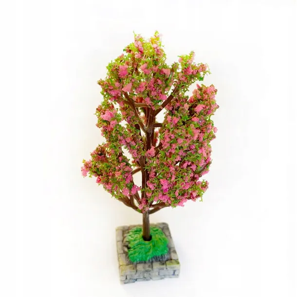 Drzewko zielone z ciemno różowymi nieregularnymi elementami na kształt owoców, na podstawce - do postawienia.
