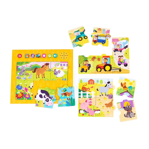 Układaj puzzle, poznając przy tym zwierzątka mieszkające na wsi, na łące, a także maszyny rolnicze. W zestawie znajdziesz 18 dużych puzzli do ułożenia 3 obrazków oraz wygodną podkładkę z wytyczoną przestrzenią, sugerującą rozmiar obrazka, co ułatwia układanie. Na górze podkładki znajdują się przyciski, aktywujące różne tryby zabawy. Na malucha czekają zgadywanki, rozpoznawanie odgłosów zwierząt, a także wiele dźwięków i melodii.