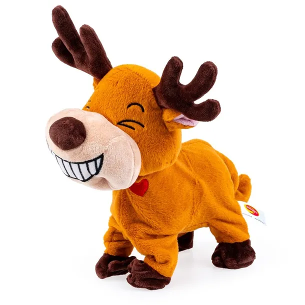 Radość w najczystszej postaci! Uroczy wesołek zanosi się śmiechem, wierzgając przy tym raciczkami, stając na dwóch nogach i wykonując zabawne ruchy, a wszystko po to, aby rozśmieszyć malucha. Zwierzaczek posiada z boku, pod pyszczkiem, czerwone serduszko, odpowiedzialne za uruchamianie zabawki. Obserwuj „śmiechowe” popisy łosia i zaraź się od niego wesołością!