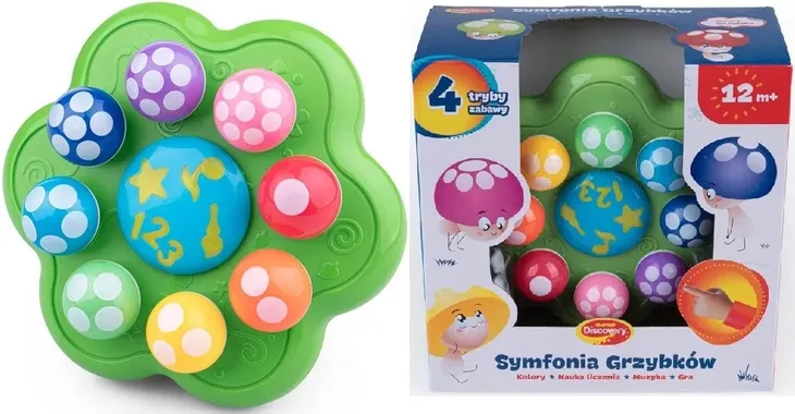 W trybie cyfry, zadaniem malucha będzie liczenie kropek, znajdujących się na kolorowych grzybkach, w trybie kolory, poznawanie nazw kolorów widocznych na grzybkowych kapeluszach, w trybie muzyka, grzybki w magiczny sposób przekształcą się w klawisze pianinka, aby maluch mógł zagrać na nich prawdziwy koncert, a w trybie gra, zabawka będzie zadawać pytania dotyczące liczenia i określania kolorów.