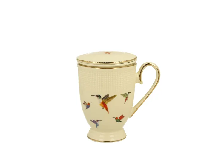 Kubek z zaparzaczem i pokrywką KOLIBRY idealny do zaparzania zdrowych ziół czy aromatycznej herbaty wchodzący w skład kolekcji ECRU. Wykonany z najwyższej jakości porcelany w kolorze śmietankowym wykończonej złotymi zdobieniami oraz motywem kolorowych koliberków