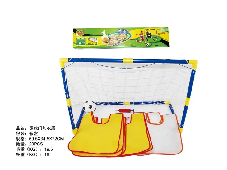 Duża bramka do ogrodu z akcesoriami dla dzieci od 3-go roku życia. W zestawie znajduje się niebieska bramka z żółtymi łącznikami, siatka, kamizelki w kolorze białym i żółtym oraz piłka z pompką.
