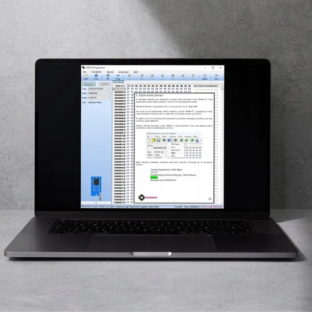 Wykonany z wysokiej jakości komponentów, w tym z układem CH341B (funkcjonalnie identycznym z CH341A, bez potrzeby zewnętrznego oscylatora), programator gwarantuje bezpieczeństwo i trwałość. Obsługuje układy bez wylutowywania dzięki klipsowi do SO8/SOP8/SOIC8, a adaptery z buforem napięciowym dla 1,8V chronią delikatne pamięci przed uszkodzeniami.