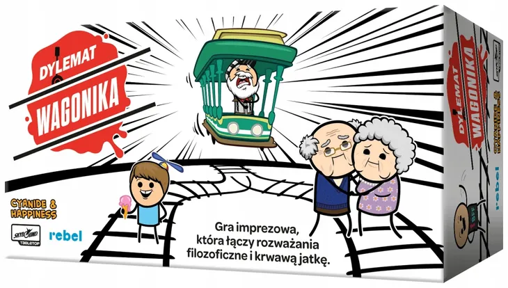 Rozważania filozoficzne i krwawa jatka w jednym!Karol Kolejarz nie spodziewał się kłopotów - dzień pracy zapowiadał się spokojnie. Przynajmniej do czasu, gdy kierowany przez niego pociąg nieco wymknął się spod kontroli. Pędząca przed siebie śmiercionośna maszyna zbliża się do rozwidlenia, nasz bohater musi zdecydować, w którą stronę skręcić, a tymczasem na każdym z torów znajdują się niczego nieświadomi ludzie...Dylemat wagonika to imprezowa gra karciana przeznaczona dla osób pełnoletnich. Łączy filozoficzne rozważania z krwawą jatką i zmusza uczestników do podejmowania trudnych moralnie czym to polega?W każdej rundzie jeden z uczestników wciela się w maszynistę - to jego zadaniem będzie podjęcie decyzji, po którym z torów przejedzie morderczy pociąg. W tym czasie pozostali gracze, podzieleni na dwie drużyny, będą starali się przekonać go do przestawienia zwrotnicy i uśmiercenia tych, którzy znajdują się na TYM DRUGIM torze. W tym celu będą wykorzystywali karty nieskazitelnych postaci, plugawych postaci oraz modyfikatorów - dobrych i złych czynów, których dokonali ludzie uwięzieni na torach. Wszystko byleby uratować swoich. Ostateczna decyzja należy oczywiście do maszynisty, który, gdy karty zostaną zagrane, będzie musiał odpowiednio przestawić zwrotnicę. Każdy gracz z drużyny, której tor stał się miejscem zbrodni, otrzymuje znacznik śmierci jako przypomnienie o plamie na sumieniu. A następnie zamieniamy się rolami!Dlaczego pokochasz tę grę? Kto zna internetowy komiks Cyanide and Happiness, ten wie, czego się spodziewać: ciężki humor, morze ironii i nieczyste zagrania będą towarzyszyły każdej kolejnej rundzie. Tu nie ma tematów tabu, a wszystko okraszone jest charakterystycznymi rysunkami. Żaden inny tytuł nie łączy tak sprawnie filozoficznych rozważań o moralności z krwawą jatką. Dokładając na tory kolejne postaci będziemy mieli okazję zastanowić się nad ich domniemaną historią. Przynajmniej do czasu, aż połowa z nich zginie! Karty i podejmowanie decyzji przez maszynistę to jedno, ale w Dylemacie wagonika większość zabawy rozgrywa się nad stołem. Opowieści związane z zagrywaniem poszczególnych kart, nadawanie ich bohaterom indywidualnego charakteru, negocjacje czy wręcz tworzenie własnej opowieści - to właśnie najbardziej lubią uczestnicy tej gry! Jeśli będzie Wam mało brutalnych decyzji, gra oferuje dwa dodatkowe tryby zabawy, które znajdziecie na końcu instrukcji!