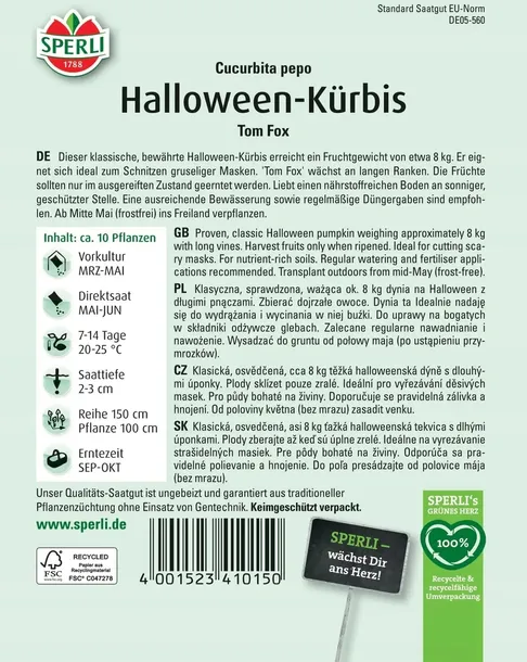 Klasyczna, sprawdzona, ważąca ok. 8 kg dynia na Halloween z długimi pnączami. Zbierać dojrzałe owoce. Dynia ta Idealnie nadaję się do wydrążania i wycinania w niej buźki. Do uprawy na bogatych w składniki odżywcze glebach. Zalecane regularne nawadnianie i nawożenie. Wysadzać do gruntu od połowy maja (po ustąpieniu przymrozków).