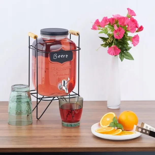 Dzięki temu praktycznemu dozownikowi lemoniady o dekoracyjnym designie możesz stylowo zaprezentować domowe soki, koktajle, a nawet wodę - idealne do domowego baru lub na następne przyjęcie w ogrodzie. Dozownik do koktajli zachwyca modnym wyglądem w stylu vintage i ułatwia nalewanie do szklanek dzięki kranikowi. Pojemnik na sok jest dostarczany z dopasowanym czarnym metalowym stojakiem z bocznymi uchwytami do przenoszenia.