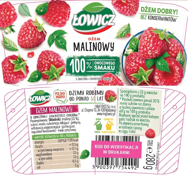 ŁOWICZ Dżem Malina o Niskiej Zawartości Cukru 280g