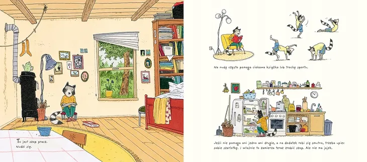 Szop pracz chce upiec szarlotkę, ale ponieważ nie ma w domu jajek, udaje się do Lisa, który potrzebuje drabiny. Idą więc do Borsuka. On ma prawie wszystko, ale również potrzebuje pomocy – od Niedźwiedzia. Tak więc cała czwórka (z Krukiem) kontynuuje wędrówkę przez pola i łąki, skubiąc po drodze jeżyny. Znajdują Niedźwiedzia z wędką przy strumieniu. Opowiadanie o piątce przyjaciół, którzy spędzają spokojny i przyjemny dzień razem. Relaksująca, pogodna i poetycka książka obrazkowa o uważności i cieszeniu się chwilą. Tak piękna w swej prostocie, że niewątpliwie ma szansę stać się klasyką.