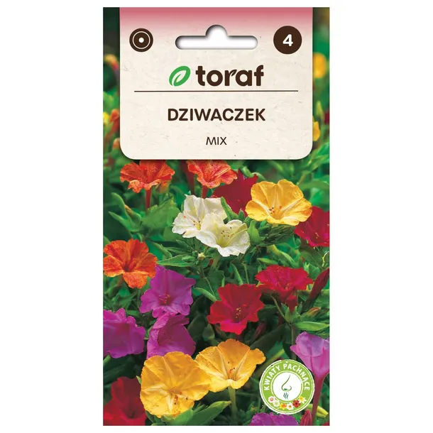 Dziwaczek MIX (Mirabilis jalapa) to jednoroczna roślina ozdobna, wyróżniająca się dużymi, intensywnie pachnącymi kwiatami, które otwierają się wieczorem i w pochmurne dni. Na jednej roślinie mogą występować kwiaty w różnych barwach, tworząc efektowny kontrast. Kolorowe płatki zawierają fluorescencyjny barwnik, który w nocy subtelnie się świeci, przyciągając owady zapylające oraz nietoperze. Wysiew w kwietniu do zimnego inspektu lub w maju wprost do gruntu pozwala na łatwą uprawę w ogrodzie. Kwitnie od czerwca do września, stanowiąc wyjątkową dekorację rabat i ogrodów.