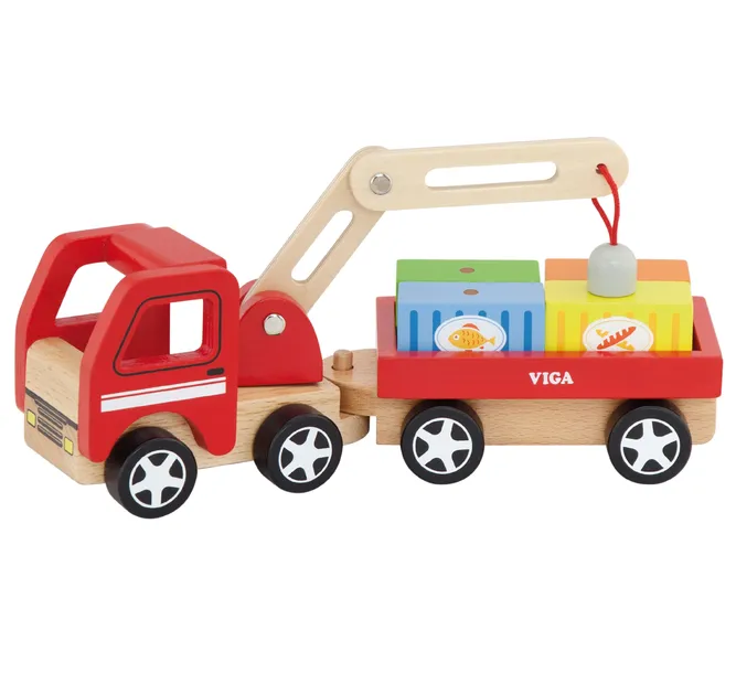 Drewniana ciężarówka z ruchomym dźwigiem i kontenerami to nie lada gratka. Każdy mały fan pojazdów będzie się świetnie bawił tym pojazdem. Poza podstawową funkcją tzn. jeżdżeniem ciężarówka ma specjalny magnetyczny dźwig. Dźwig ma ruchome ramię (ramię porusza się w górę i w dół oraz w prawo i w lewo).