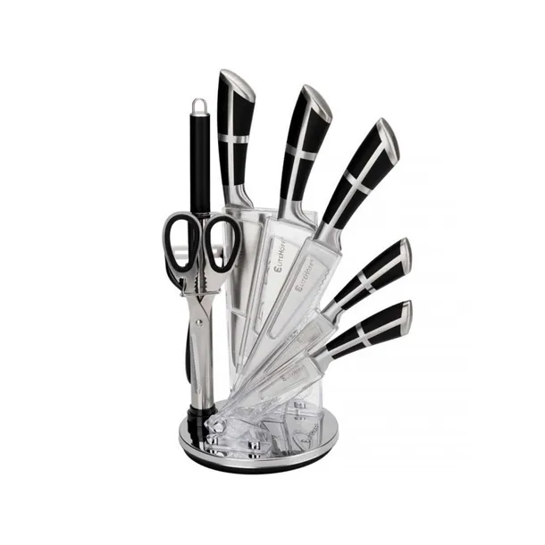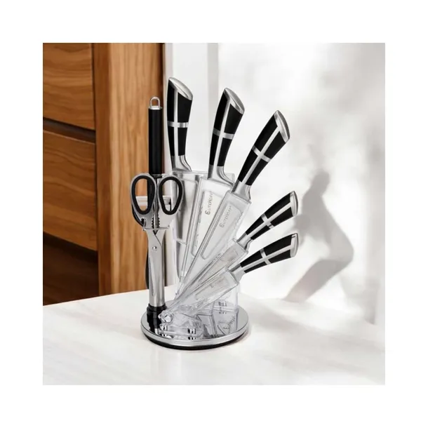 Zestaw 9-elementowy noży kuchennych w obrotowym, akrylowym stojaku w formie wachlarza to kompletny i elegancki wybór do każdej kuchni, który ułatwia codzienne przygotowywanie posiłków. Zestaw zawiera różnorodne noże do różnych zadań kuchennych – od krojenia chleba, przez porcjowanie mięsa, po siekanie warzyw, a także ostrzałkę i nożyce, które zwiększają jego funkcjonalność.