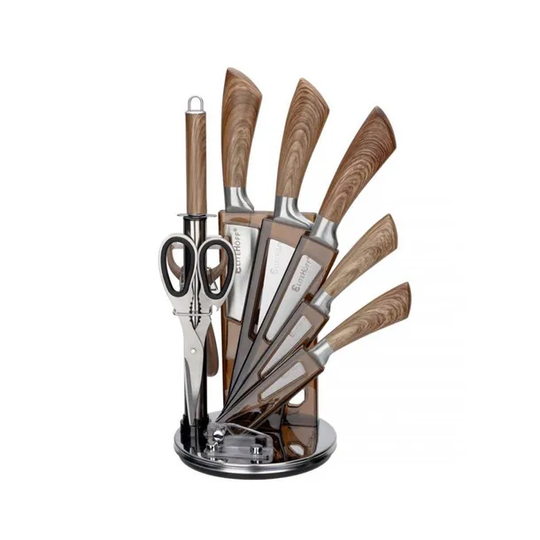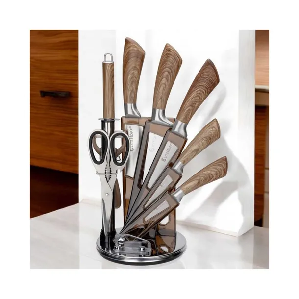 Zestaw 9-elementowy noży kuchennych w obrotowym, akrylowym stojaku w formie wachlarza to kompletny i elegancki wybór do każdej kuchni, który ułatwia codzienne przygotowywanie posiłków. Zestaw zawiera różnorodne noże do różnych zadań kuchennych – od krojenia chleba, przez porcjowanie mięsa, po siekanie warzyw, a także ostrzałkę i nożyce, które zwiększają jego funkcjonalność.