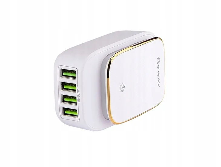 Ładowarka sieciowa z 4 gniazdami USB-A. Łączna moc gniazd USB wynosi 4.4A z funkcją Auto-ID - automatycznie identyfikują baterię urządzenia dostosowując odpowiednio moc ładowania.