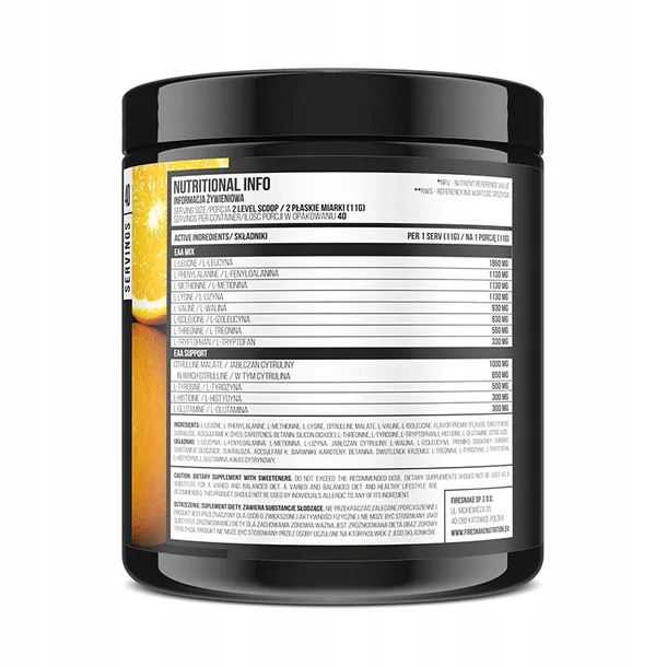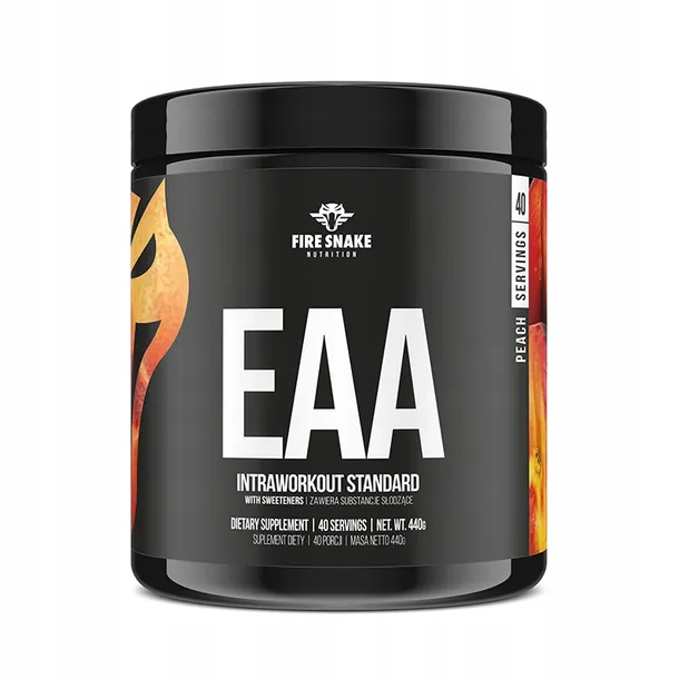 FireSnake EAA INSTANT – kompleksowy preparat, którego każda porcja zawiera najwyższej jakości instanizowane aminokwasy wzbogacone o specjalną mieszankę witamin i minerałów, z których niedoborem najczęściej borykają się sportowcy. Stosując go regularnie w okolicy treningu jesteś w stanie zmaksymalizować osiągane przez siebie efekty w postaci przyrostu beztłuszczowej masy mięśniowej. Ogranicza także procesy kataboliczne chroniąc je tym samym przed rozpadem. Formułę wzbogacono o minerały i witaminy z grupy B, niezbędne do prawidłowej pracy organizmu podczas ciężkich, wyczerpujących sesji treningowych, co czyni go niemal kompletnym preparatem około treningowym. Umożliwia wykorzystanie tzw. „okna anabolicznego”. Zawiera wszystkie 8 aminokwasów egzogennych, czyli tych, których organizm człowieka nie potrafi samodzielnie syntetyzować, a których obecność w organizmie jest konieczna do budowania i ochrony tkanki mięśniowej.
