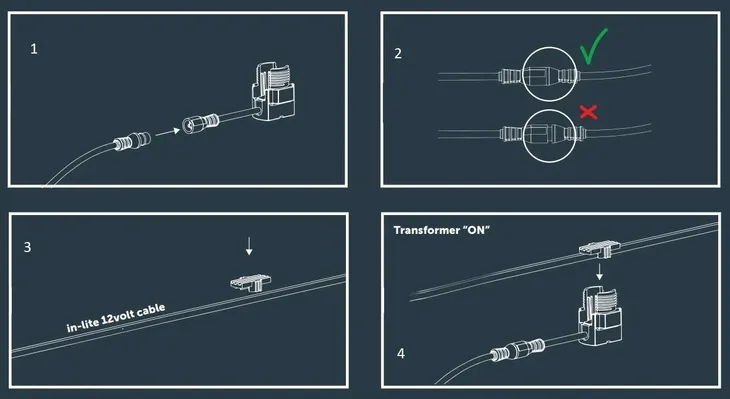 Zamocuj Easy-Lock tak, aby mieć do niego łatwy dostęp w dowolnym momencie. Jeśli instalujesz oświetlenie naziemne Ø60 mm, pamiętaj, że musisz zainstalować Easy-Lock bezpośrednio pod oprawą. Przy światłach naziemnych 22 mm Easy-Lock nie zmieści się w oprawie, dlatego zaleca się pracę z przedłużaczami. Następnie podłączasz Easy-Lock do łatwo dostępnego kabla głównego, aby później nie napotkać żadnych nieprzewidzianych problemów.