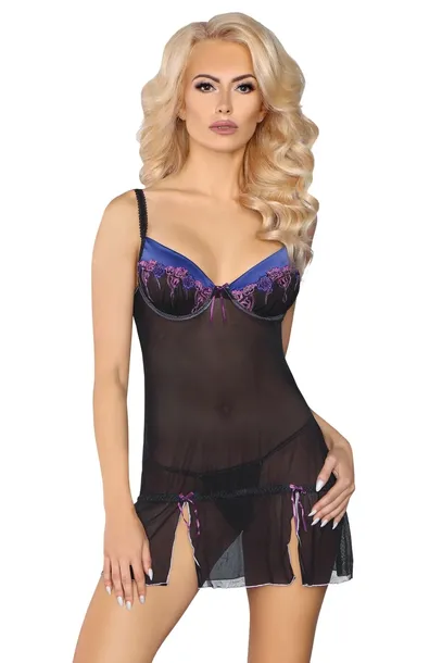 Ebony przylegając do ciała ładnie podkreśla talię, biodra, uwypukla kobiece kształty. Połączenie błękitu z czernią sprawia, że kobieta nosząca ten komplet wygląda zmysłowo i pięknie. Miseczki ozdobione zostały niebieskimi wstawkami, motywami kwiatów oraz subtelną kokardką. Cienkie ramiączka podkreślają ramiona i szyję. Dolne wcięcia oraz cienki pasek eksponują kobiece biodra.