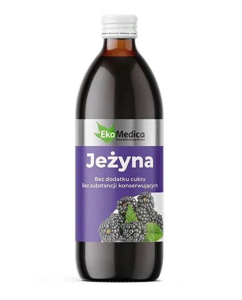 Jeżyna - suplement diety w formie płynnej, wyprodukowany z puree 100% z owoców jeżyny z dodatkiem naturalnej witaminy C pochodzącej z ekstraktu z owoców camu camu.