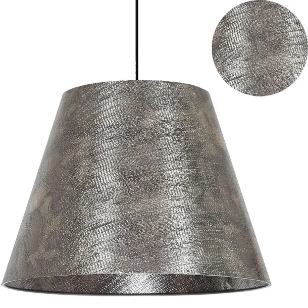 - Nieszablonowy abażur z tworzywa, lustrzana gładka powierzchnia w kolorze miedzianym, zawieszony na standardowej lince plastikowej w czarnym kolorze