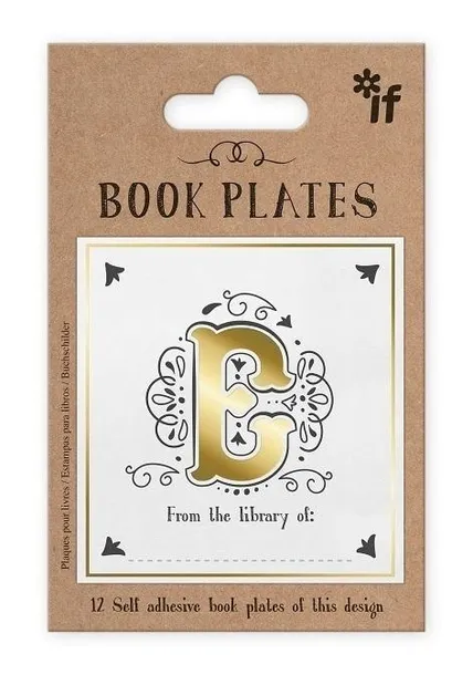 Zestaw 12 samoprzylepnych ekslibrisów z literą E. Naklejki są złocone. Całość zapakowana w eleganckie opakowanie kraft. Doskonały dodatek do prezentu dla mola książkowego.