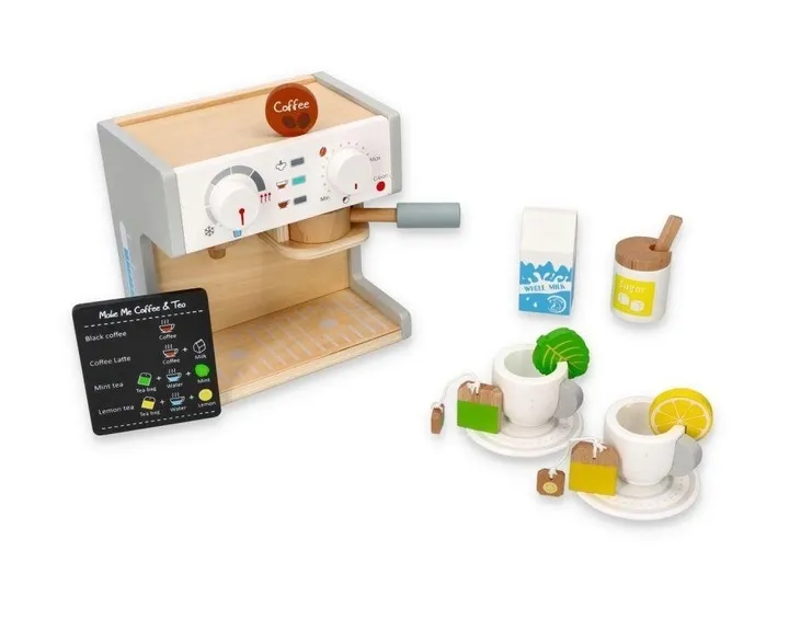 Ten wysokiej jakości drewniany ekspres do kawy i herbaty charakteryzuje się nie tylko realistycznym wyglądem, ale także bogatym wyposażeniem. W zestawie znajduje się kompletny zestaw akcesoriów - od ruchomego podajnika kapsułek, przez filiżanki ze spodeczkami, po autentyczne torebki herbaty ze sznureczkiem i plasterek cytryny, które idealnie odwzorowują prawdziwe czynności dorosłych.