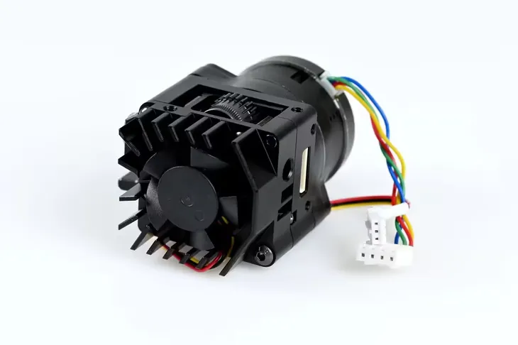 Unikalny mechanizm napinania z predefiniowanymi poziomami napięcia zapewnia płynne podawanie filamentu, minimalizując ryzyko zacięć. Dodatkowo, system demontażu koła napędowego ułatwia czyszczenie i konserwację, wydłużając żywotność urządzenia. Ekstruder wyposażono w wentylator bez ramy, który zmniejsza wagę, a jednocześnie zapewnia skuteczne chłodzenie, poprawiając jakość wydruku i utrzymując optymalną temperaturę filamentu.