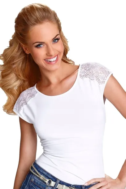 Koszulka wyróżnia się eleganckim i kobiecym designem. Krótkie rękawy ze wstawkami z delikatnej koronki na ramionach dodają jej uroku i szyku. Dopasowany fason podkreśli Twoją figurę, sprawiając, że poczujesz się pewna siebie i atrakcyjna.