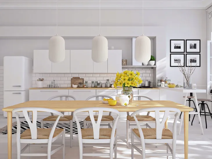 Lampami wiszącymi można subtelnie podzielić przestrzeń, na przykład tworząc wizualną granicę między częścią jadalnianą, a salonem w otwartych planach pomieszczeń.