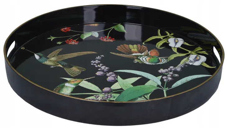 Okrągła taca z wygodnymi uchwytami po obu stronach. Zewnętrzny rant czarny ze złotymi wykończeniem.