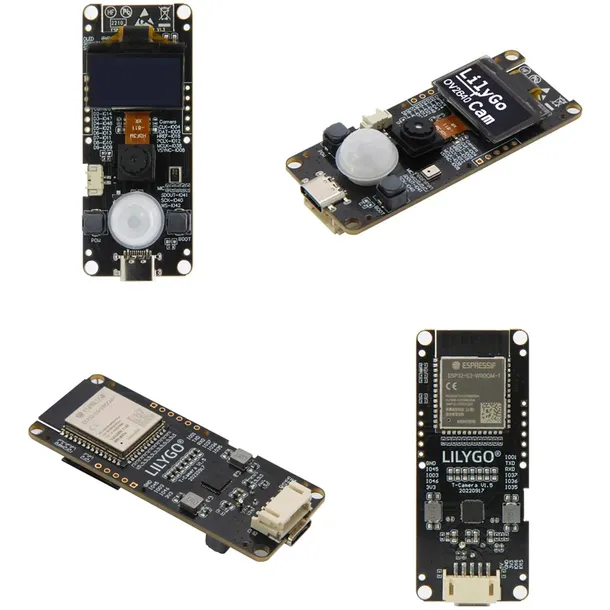 Moduł LilyGO T-Camera S3 - zbudowany w oparciu o najnowszej generacji mikrokontroler ESP32-S3 z kamerą, wyświetlaczem OLED o przekątnej 0.96" i rozdzielczości 128x64, mikrofonem i czujnikiem ruchu PIR. ESP zapewni nam łączność bezprzewodową za pomocą WiFi oraz Bluetooth 5.0. Moduł został wyposażony w złącze USB-C, przez które dzięki konwerterowi UART możemy zarówno zasilać jak i programować płytkę.Moduł można również zasilić przez baterię Li-Po 3.7V przez dostępne złącze JST-PH 1.25mm 2PIN (wtyczka dołączona do zestawu). Dodatkowo na płytce wyprowadzono złącze 5pin oraz 2 przyciski.