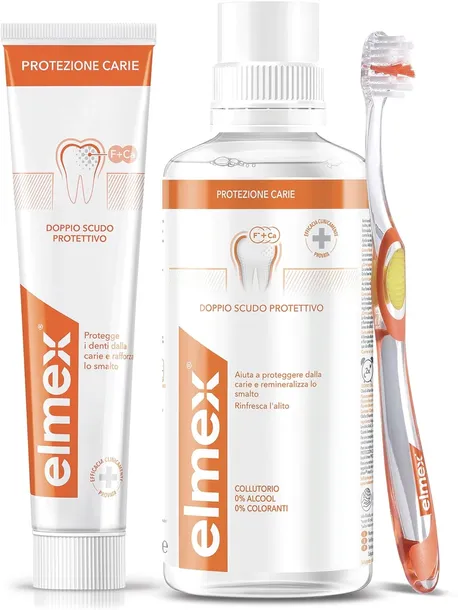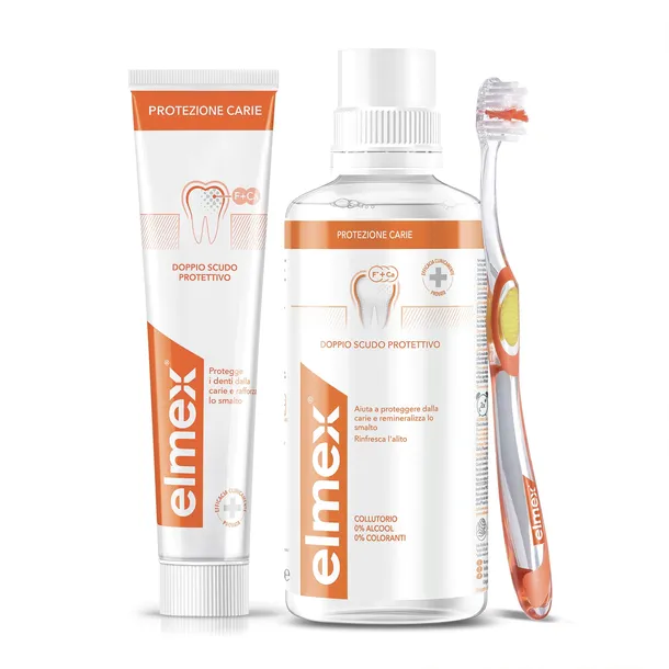 OPIS PRODUKTU Zestaw specjalny ELMEX Protection Caries zawiera pastę do zębów i płyn do płukania jamy ustnej ELMEX Protection Caries ze szczoteczką do zębów ELMEX Protection Caries InterX Medium. Specjalny pakiet ELMEX remineralizuje i chroni zęby przed próchnicą, skuteczność potwierdzona klinicznie. +34% skuteczności przy łączonym stosowaniu pasty do zębów i płynu do płukania jamy ustnej*. Aby zapewnić sobie lepszą ochronę, eksperci zalecają następujące działania: - Pastę do zębów z fluorem w połączeniu z płynem do płukania ust - Szczoteczkę do zębów i produkty do czyszczenia przestrzeni międzyzębowych *Łączne stosowanie pasty do zębów i płynu do płukania ust ELMEX Protection zapobiega próchnicy o 34% skuteczniej niż samo szczotkowanie.