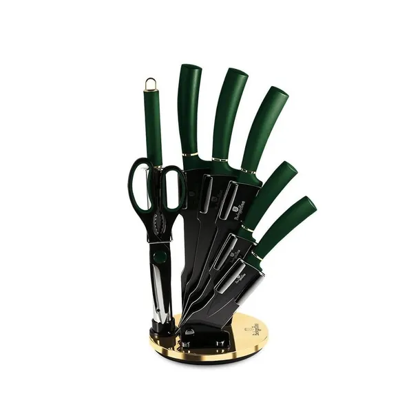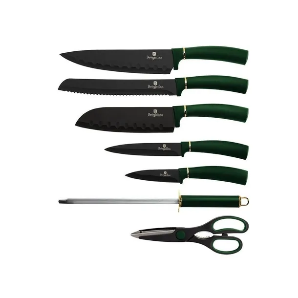 8 elementowy zestaw noży na stojaku firmy BERLINGER HAUS z serii Emerald. Przeznaczone do porcjowania mięsa i ryb, krojenia pieczywa oraz obierania i siekania warzyw. Noże ze stali nierdzewnej dodatkowo pokryte powłoką nieprzywierającą non-stick. Wyposażone w uchwyty pokryte bardzo trwałą cienką warstwą silikonu dla uzyskania pewnego trzymania w każdych warunkach.