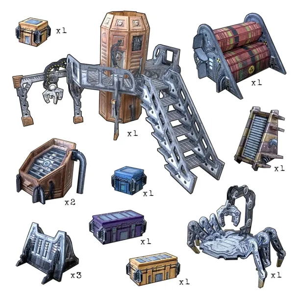 Ten pakiet zawiera wszystko, czego potrzebujesz, aby wzbogacić swój stół do gier science fiction o maszynownię lub rafinerię. Zawiera podniesioną platformę, osłony przeciwwybuchowe i sześcionożnego robota transportowego. Zestaw jest kompatybilny ze wszystkimi podstawowymi zestawami Battle Systems Sci-fi.