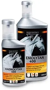 Wsparcie witalności. Wydajność: w zależności od ilości podawania i wysiłku (różne dawkowanie) 1 000 ml PRZEZNACZENIE Konie sportowe i rekreacyjne. ZASTOSOWANIE HAEMOLYTAN 400 jest mieszanką paszową uzupełniającą dla koni wzbogaconą w witaminy i pierwiastki śladowe dla wsparcia witalności. ZALECENIA HAEMOLYTAN 400 pomaga zapewnić składniki odżywcze niezbędne do regeneracji organizmu podczas i po okresach wzmożonego wysiłku lub w trakcie wymaganego wsparcia (np.: osłabienie organizmu, rekonwalescencja, ogiery w czasie krycia czy klacze w ostatnim trymestrze ciąży). INSTRUKCJA STOSOWANIA Przed użyciem wstrząsnąć. Konie (500 kg): 10-15 ml / dzień lub 20 ml 2-3 razy w tygodniu.Konie ras lekkich, pony, źrebięta: 5-10 ml / dzień lub 15 ml 2-3 razy w tygodniu.Podawać z paszą, wodą lub bezpośrednio dozownikiem oralnym.Ze względu na wysoką zawartość pierwiastków śladowych w mieszance, nie przekraczać 120 ml/konia o m.c. 500 kg / dzień.Po użyciu szczelnie zamknąć. SKŁAD Syrop cukrowy, glicerol, cynk, żelazo, miedź, witamina B1, witamina B6, niacynoamid, D-pantotenian wapnia, witamina B2, kwas foliowy, witamina K3, witamina B12, glicyna.Pełen skład znajduje się na etykiecie produktu.