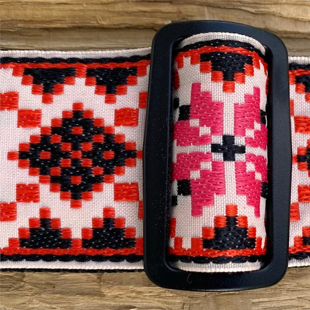 Pasek “Cinnamon Needlepoint” jest wykonany ze splotu czerwonych, czarnych i jasnoróżowych (bardzo jasno) nici tworzących przykuwający wzrok kwiatowo-geometryczny wzór. Pasek jest odporny na rozciąganie i nie blaknie od słońca.