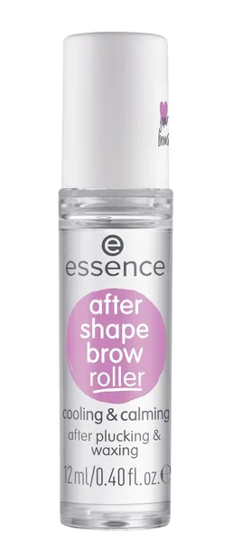 After Shape Brow Roller marki Essence. Roller do brwi. Przeznaczony do nakładania na suchą i czystą skórę kilka minut po wyrwaniu włosków lub depilacji woskiem. Zawiera kwas hialuronowy, aloes i panthenol, które silnie nawilżają i odżywiają skórę. Jednocześnie przyjemnie chłodzi i koi podrażnioną wcześniejszymi zabiegami skórę. Posiada metalowy aplikator, który ułatwia aplikację. Specyfik szybko się wchłania i nie wymaga zmywania po nałożeniu. Dostępny o pojemności 12 ml.