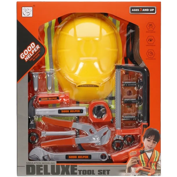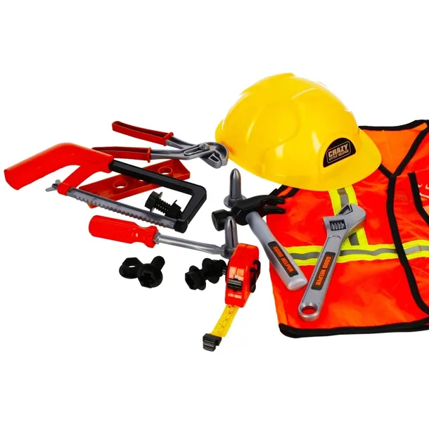 Dzięki niemu każde dziecko nauczy się jak przykręcać śrubki czy poprawnie używać wiertarki Interakcja rodzic-dziecko pobaw się i spędź czas ze swoim dzieckiem Zawartość zestawu: kask, kamizelka ochronna, piła ręczna, młotek, klucz hydrauliczny, metrówka, śrubokręt, klucz hydrauliczny, deseczka do wkręcania śrub, 3 śruby, 3 nakrętki. Całość wykonana z plastiku oraz materiału. Wymiary/waga/baterie: wymiary produktu dł. x wys. x gł. cm : kask-18x9x24, kamizelka szer. x dł. x wys. x gł. Zestaw przeznaczony dla dzieci w wieku: 3 . Pakowany w kartonik z okienkiem. W kartonie zbiorczym po 12 szt.
