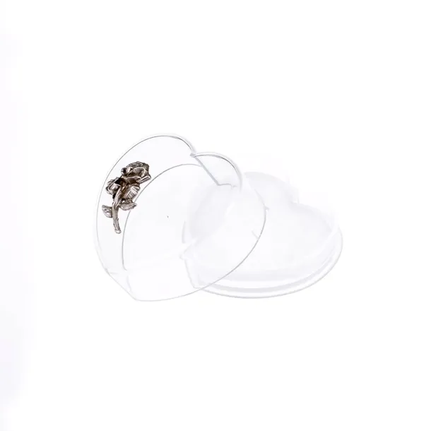 Praktyczne etui na różaniec w kształcie serca. Wykonane z tworzywa z przodu metalowa róża w kolorze srebrnym. Etui może być wyjątkowym prezentem z okazji uroczystości religijnych.