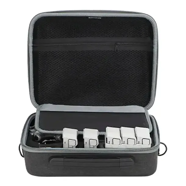 Sunnylife N4P-B698 to wysokiej jakości torba, w której zmieszczą się wszystkie niezbędne akcesoria. Jej wnętrze posiada wytłaczane przegrody na drona, kontroler (dodatkowo zabezpieczany pasem), ładowarkę i 5 akumulatorów - dzięki temu akcesoria stabilnie leżą w osobnych przegrodach, co zapobiega ich obijaniu się o siebie czy szamotaniu po torbie, a także większa bezpieczeństwo przy wstrząsach. W przegrodach spokojnie zmieszczą się dron i kontroler z osłonami.