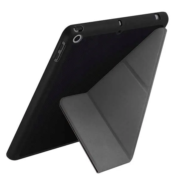 Minimalistyczne etui posiada klapkę ochronną składana niczym origami- dzięki temu etui pełni również funkcję podstawki regulowanej w kilku pozycjach.