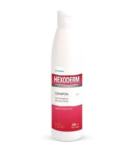 Hexoderm jest dermokosmetykiem weterynaryjnym, regulującym mikroflorę skóry, stabilizującym jej pH oraz zapobiegającym wysuszaniu poprzez pozostawienie cienkiej warstwy tłuszczowo-białkowej. Zawarte w płynie łagodne środki myjące pozwalają na jego częste stosowanie.