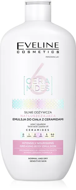 Silnie odżywcza natłuszczająca emulsja do ciała z serii 6 ceramidów to silnie odżywiający i regenerujący kosmetyk, który skutecznie i szybko zadba o odpowiednie nawodnienie i odbudowę skóry. Skład zawiera 5 kluczowych, naturalnie występujących w skórze ceramidów oraz dodatkowy pro-ceramid pochodzenia roślinnego, które odbudowują struktury lipidowe, czyniąc skórę optymalnie nawilżoną i uelastyczniona. A dzięki zawartości mocznika i skwalanu likwiduje objawy podrażnień, zmiękcza, wygładza i uelastycznia naskórek. Bogata w kwas mlekowy i olejek jojoba formuła natychmiast łagodzi suchą i wrażliwą skórę. Dodatkowo szybko się wchłania, pozostawiając na skórze okluzyjną, ochronną powłokę.