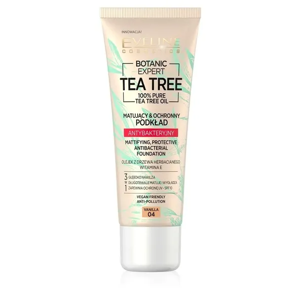 Podkład Botanic Expert Tea Tree nadaje cerze satynowo-matowe wykończenie i gwarantuje perfekcyjny wygląd. Umożliwia stopniowanie krycia, maskuje niedoskonałości i przebarwienia. Nie wysusza i nie zatyka porów. W 100% naturalny olejek z drzewa herbacianego, cynk oraz kompleks antyseptyczny wspomagają codzienną pielęgnację cery, działają przeciwbakteryjnie, ograniczają wydzielanie sebum i powstawanie zmian skórnych. Wyciąg z zielonej herbaty działa jak naturalna bariera anti-pollution, a witamina E regeneruje, odmładza i działa antyrodnikowo. Podkład zawiera filtr ochronny SPF 10. Vegan friendly.