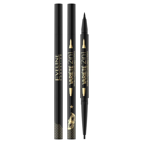 Eyeliner w pisaku umożliwi wykonanie idealnej kreski jednym pociągnięciem. Z drugiej strony znajduje się automatyczna kredka kajal, która pozwoli na wykonanie doskonałego obrysu wokół oka. Dzięki delikatnej formule zabarwi bez dociskania linię oczu. Kosmetyk charakteryzuje wysoka trwałość. Cechy i właściwości eyelinera Eveline Variete 2in1 Double Effect