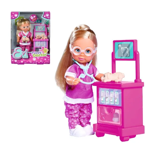 Laleczka Evi ma długie blond włosy spięte w kucyka i niebieskie oczy, schowane za białymi okularami. Ubrana jest w charakterystyczny strój weterynarza zwierząt oraz białe, płaskie butki. Głowa laleczki oraz ręce są ruchome.