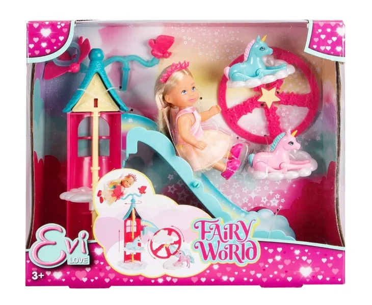 Przeżyj magiczne chwile z zestawem Evi Love Fairy. Wróżka Evi Love i jej 2 jednorożce przekształcają pokój każdego dziecka w magiczne miejsce. Ze swoimi kolorowymi wróżkowymi skrzydłami i piękną błyszczącą sukienką w pastelowych kolorach, Evi Love wygląda magicznie jak wróżka. Razem ze swoimi małymi jednorożcami Evi Love może przeżyć magiczne chwile jako wróżka na dołączonej wieży do zabawy. Zjeżdżalnia, winda napędzana korbą, a przede wszystkim magiczny diabelski młyn chmurka, na którym zmiesz