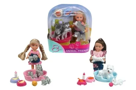 Tutaj Evi zajmuje się swoimi czworonogami. W zestawie znajdziemy lalkę Evi, cztery zwierzaki, leżankę, miski na pokarm, butelki na mleko i zabawki.