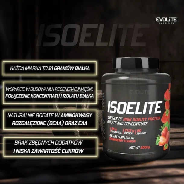 Evolite IsoElite 2000 g jest to mieszanka wysokiej jakości izolatu oraz koncentratu białka serwatkowego w stosunku 1:1, które dostarczają organizmowi niezbędnych aminokwasów i składników odżywczych.