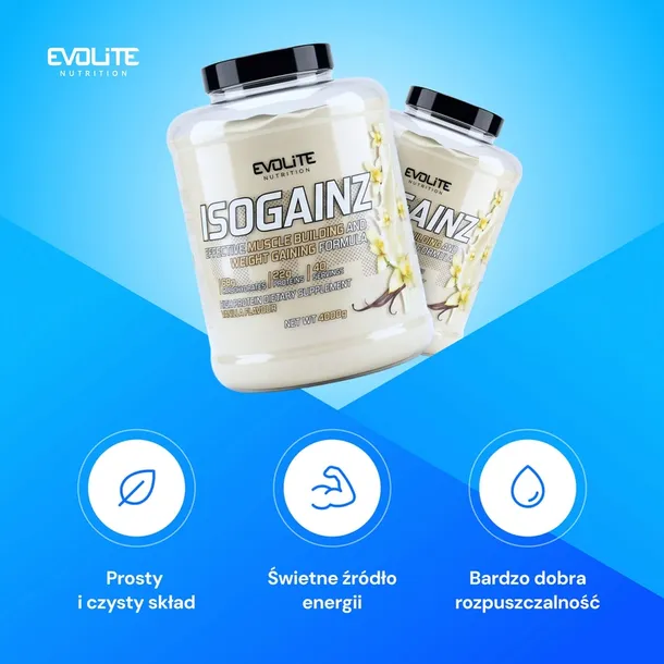 Evolite IsoGainz 4000 g to gainer, który ma za zadanie dostarczyć niezbędnych składników odżywczych do regeneracji i budowy komórek mięśniowych, dzięki czemu może wspomagać wzrost masy.