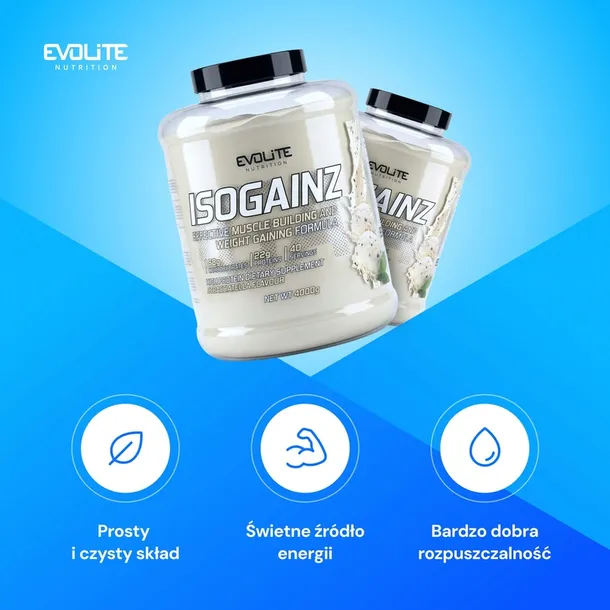 Evolite IsoGainz 4000 g to gainer, który ma za zadanie dostarczyć niezbędnych składników odżywczych do regeneracji i budowy komórek mięśniowych, dzięki czemu może wspomagać wzrost masy. Ze względu na swój skład, gainer często bywa stosowany przez osoby które mają problem z utrzymaniem diety, w której skład wchodzą tylko zwykłe posiłki. Dlatego też Evolite IsoGainz 4000 g może być stosowany jako zamiennik, który pomoże Ci wypracować nadwyżkę kaloryczną. Prosty sposób użycia pozwala na przygotowanie wysokokalorycznego shahe'a w domu lub w pracy i treningu.