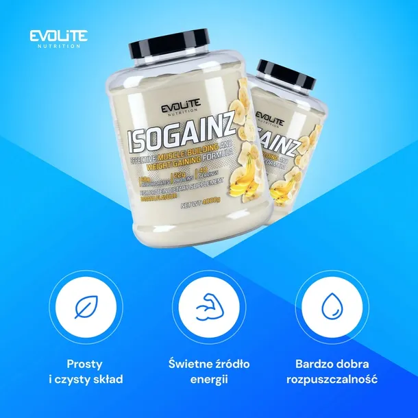 Evolite IsoGainz 4000 g to gainer, który ma za zadanie dostarczyć niezbędnych składników odżywczych do regeneracji i budowy komórek mięśniowych, dzięki czemu może wspomagać wzrost masy. Ze względu na swój skład, gainer często bywa stosowany przez osoby które mają problem z utrzymaniem diety, w której skład wchodzą tylko zwykłe posiłki. Dlatego też Evolite IsoGainz 4000 g może być stosowany jako zamiennik, który pomoże Ci wypracować nadwyżkę kaloryczną. Prosty sposób użycia pozwala na przygotowanie wysokokalorycznego shahe'a w domu lub w pracy i treningu.
